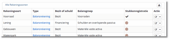 Let op: Rekeningsoorten die niet kunnen worden gewijzigd hebben in de actiekolom geen mogelijkheden. Dit zijn rekeningsoorten welke door Bokbiz worden gebruikt en beheerd.