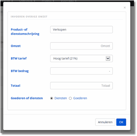 Per omzetregel kan een korte product- of dienst omschrijving ingevoerd worden. Standaard staat deze tekst op 'Verkopen'. Daarnaast dient aangegeven te worden of het diensten, dan wel goederen betreft. De juiste aanduiding hiervan is van belang voor de BTW-aangifte.